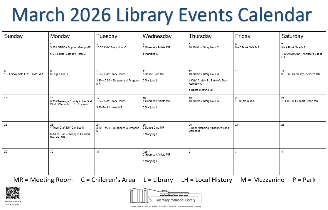 Databases, ebook and audiobook resources, and streaming video and music sources: HoursMon – Thurs 9 – 8Fri 9 – 6Sat 9 – 4Sun 1 – 4(Closed on Sundays in the summer) Guernsey Memorial Library3 Court StreetNorwich, NY 13815607-334-4034guernsey@4cls.orgRegister online for a library card here! Total Page Visits: 87928 - Today Page Visits: 106